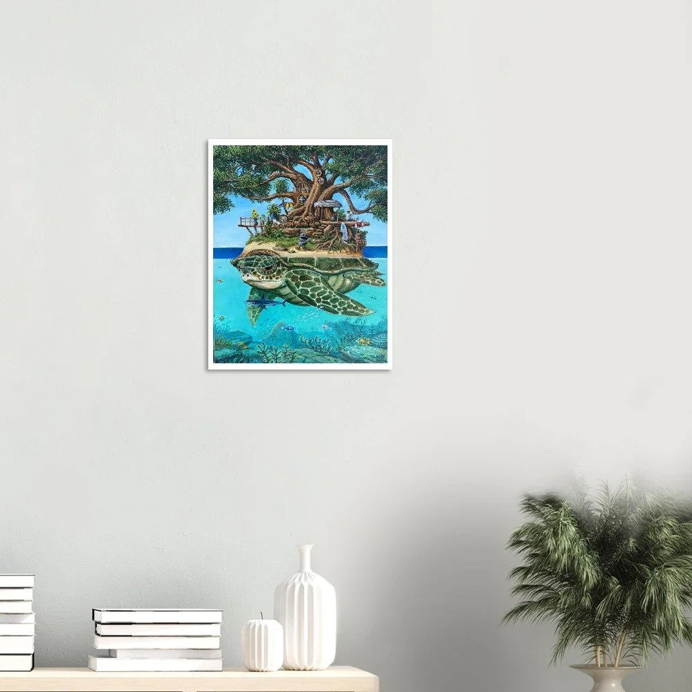 Discover Turtle Island, a whimsical and enchanting scene where a gentle giant turtle carries a lush island on its back. A beautiful treehouse sits high in a sprawling tree, with a fisherman peacefully on the dock, rod in hand, while his loyal dog gazes out at the sparkling sea. Product Details: Printing: Vivid 12-color giclée fine art printing Paper: Smooth matte, 200 gsm (0.26 mm) Sizes: Multiple options to fit any space or frame Eco-Friendly: FSC-certified materials Orders: On-demand, no minimum order.